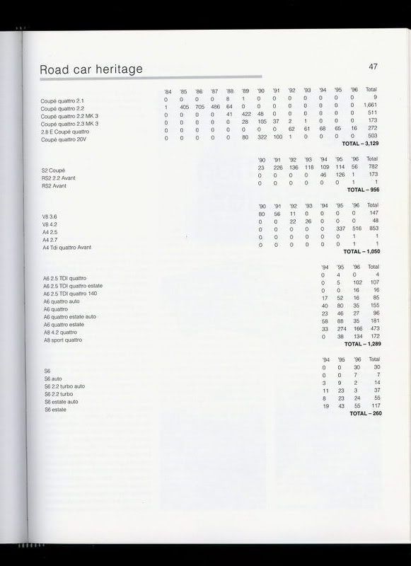 great well thats a excellent start,cant say i ever saw any B reg 90's myself.Think i saw 1 B plate t85 coupe quattro many years back. Ian,did those numbers come out of an Ur quattro book by any chance? a mate had a book somewhere that gave loads of figures but i havnt seen it in 8+ years. |