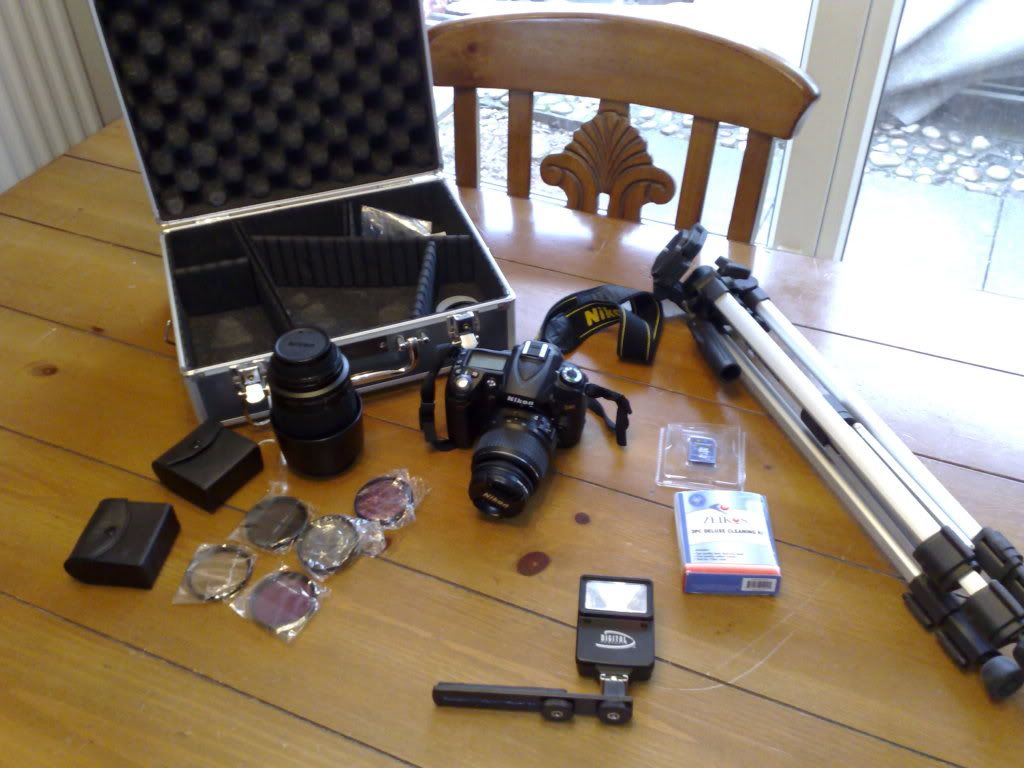 I bought the 'complete' kit a year ago for just over 1k and I just do not use it. It is a complete travesty it just sitting in the case never getting used. For what I take a digital compact will easily suffice. So...and I'm probably gonna regret this! Camera body = Nikon D90. Fully automatic / manual Digital SLR with 12 million pixels. It also has full HD video capability. Camera comes with a Nikon shoulder strap and all lense covers and also a screen protector for the rear display screen. If you look on Amazon you will see the body alone ( without any lenses) is 625 pounds. If your interested have a look on the net for the full spec of the camera as I cannot begin to do it justice here. Two lenses are with the camera. 1 x standard lense = Nikon 18 - 55mm 1 x zoom lense = Nikon 70 - 300mm with lense shield The kit comes with the following 1 x alluminium camera case. Partitioned so everything fits in and has a place. 1 x telescopic alluminium tripod. Extends from .5metres to 1.75metres. With spirit level for optimum alignment. 1 x Digital Concepts Fully automatic flash with 'hot-shoe' attachment to the camera. Flash has 4 x slave modes. 2 x 4GB SD memory cards, ones in the camera the other is a spare. Lense cleaning kit. 5 x filters in 2 x leather cases, various including polarised, charcoal, e.t.c. Few pics 'The lot' ![]() Camera ![]() Standard Lense ![]() Zoom Lense ![]() There are no faults with ANY of this equipment. It works exactly as it should. The price I want is £700. Which is I think an absolute steal for someone wanting a top notch complete set.