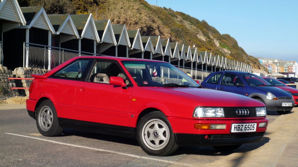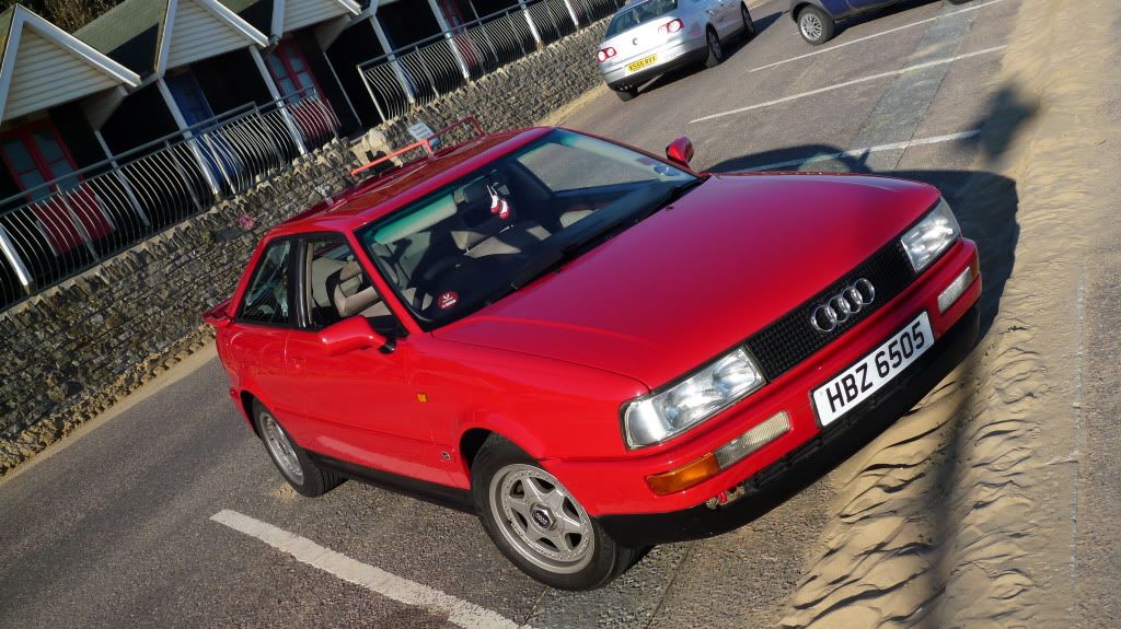 Hi everybody I'm gonna test the water and see if anyone has interest in my car. Its a 1990 Tornado Red B3 Coupe Quattro with 123k miles, 20V 7A engine. Had 3 owners since new, I've had the car since last April and I have invested a lot of time and money into it since. (more than the price I paid for it) It was bought from a member on this forum who was selling this to fund a clutch replacement for his RS2 Reason for the sale is that I can't afford to keep it anymore; its my only car and its used as a daily driver/shopping trips/weekend of spirited driving vehicle. In honesty I don't need to own a car, its just a guilty pleasure. Its sat outside my flat most of the time not getting used, also I don't have access to a garage to do the more demanding jobs I would like to do myself and also i'm limited by my mechanical knowledge so I have to take it down to my local VAG specialist garage for the tricky tasks. Anyways i'll list the plus and negative points of it, i'll be completely honest as I can as we all know here what the pros and cons of Coupe ownership bring. Good points: It was treated to a full respray by the previous owner in original tornado red, it looks immaculate after a good clean and wax and there is only one dent on top of the front nearside fog light about an inch across as well as sone stone chips along the side from a result of some snowy car park fun I had after this wonderful winter. Alloys are original 15" Speedlines in great nic, has brand new Hancook tyres on rear and Yokohamas on front with about 4 mil tread left. Last owner had a lot of work done to the suspension involving wishbones and various bushes, I don't have exact details of what was done but car drives very well with no nasty knocks or juddering. Has new cam belt, water pump, and timing chain and new coolant in January, this was to sort out a nasty rattle due to a duff chain, as the chain needed replacing I went ahead and did the cam belt and waterpump. This was done at Advanced Auto Repair in Christchurch who are VAG specialists New Rad fitted last year as the old one had a blockage and was boiling the coolant, new thermo switch and coolant replaced as well. Engine runs fine, the gauge shows it running quite hot but I think this to be a sensor issue (see Rusty's thread in guides and top tips section here on Gauges and where needles should sit) Aux rad cuts in and out properly and engine runs very well. I got a new Bosch distributor for the car in Febuary curtosey of Tom from RCMR here on the forums. its an original item costing £220 with a steel drive gear. He has seen and driven the car and has told me it drives very well for a coupe. I re-did the roof lining last year as the old material was dropping down, mouldy and smelt nasty due to a sunroof leak. Its not 100% but looks much better. I Fitted a new drainage hose to the N/S passenger side and POR15'd a rusty bit. Car stays nice and dry Rest of interior is in good nic for a 20 year old car. Radio aerial was replaced as the old one wasn't connected and was letting water into the car. Its had a mod to the gearbox involving a brass gear to cure transmission whine, this was done by the previous owner its been waxoyl'd as well, no rust anywhere on the car that I know of. Has a Toad Ai606 cat 1 alarm immobiliser that cost me nearly £300 with fitting. Has a wharfedale CD player with aux-in and i'll sell the car with the original blaupunkt head unit which I believe to be a factory fitted head unit. I've fitted a Pioneer TSWX20LPA Powered sub in the boot which is an awesome bit of kit, cost me £250 new New Bosch silver battery Most interior electricals work, Diff lock and ABS switch work as they should. Replaced driver side window and cartridge assembly this year after the old one frayed a cable curtosey of Acidburn here. Windows are nice and smooth. Boot and clusters have been resealed with butyl and I replaced the rubber boot seal to cure a nasty leak. I was tired of getting frost both inside and outside of the rear window. It stays nice and dry now and there's little to no condensation inside the car in the morning. It gets treated to wash and wax every few months with Meguiars products. Like I said the car doesn't do a lot of miles so doesn't get a chance to get very dirty apart from the odd bit of Dorset guano. Its been decatted, but has original exhaust. Bad Points Theres a loud ticking coming from the distributor near the top of the head after the engine is warmed up. The noise was there before the new diz was fitted but its remained. Doing a bit of reading on 20v.org its mentioned there is a bit of play in the drive gear which can cause ticking around 2000rpm which is what happens to mine. I've examined the distributor myself and there is a tiny bit of play so this could be the culprit. Tappets have been checked at a garage and they're fine. I think the front brakes are warped, under heavy braking I get steering wheel judder. I've got some new front discs and pads to put on but haven't got around to fitting them. I'll throw em in with the sale. Its missing the Quattro front grille badge, and missing the badges from the rear of the car aside from the four rings. Reason is the last owner didn't put them back on after he resprayed the car. I have some of the boot badges but they're in poor condition. It smells of fuel inside the car, the fuel pump is very noisy but is still working. The Rocker cover gasket is a tad poor but there's no leaks, two of the allen key heads have snapped off but its holding pressure alright. Recently after a cold start the idle fluctuates quite a bit and settles down after its warmed up. I've noticed excessive fuel consumption recently as well. Could be a lamba sensor issue or another electrical problem or maybe related to the fuel pump. The Power Steering Accumulator leaks bady and doesn't hold pressure, you have to rev the engine to turn the wheels at low speed. I've ordered a replacement one from Custom Auto Craft which will 