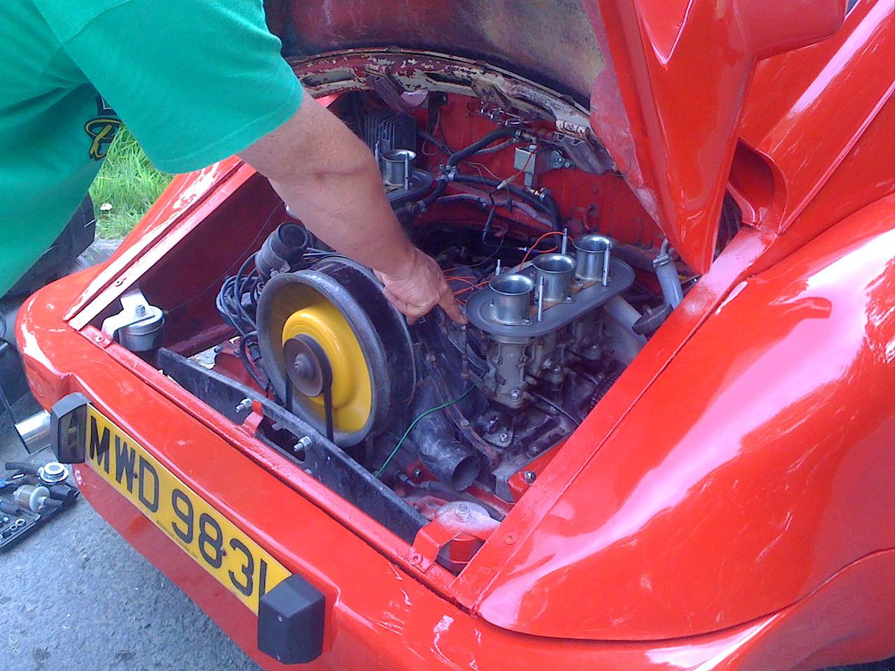 Adaptor plate for the box to engine and a custom loom, oh and a discreetly located radiator! Here's a pic of the flat 6 in the chaps down from me's bug ![]() Firewall has been moved about 5 inches forward to accommodate. |
