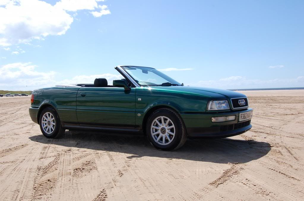 I am selling my lovely Audi 80 Cabriolet 2.6 V6, Manual, 140k Cactus Green Pearl Metallic, Completely Original Condition, 3 Spoke Airbag Steering Wheel, Black Half Leather Interior in excellent condition, New MOT with no advisories, Tax until Dec 2013, Brakes overhauled all round (new discs & pads, flexi hoses, calipers stripped and rebuilt with new seals, new wishbones,bushes, top mounts, ball joints and track rod ends. Original head unit and multichanger, genuine manual roof in great condition with clear rear window. Drives superb, body in good condition with a deep shine, however there are the usual dings and scrapes as expected of a 16 year old car. Only selling as I have two others that I want to get cracking on. Andy 07525 298334 ![]() ![]() ![]() ![]()